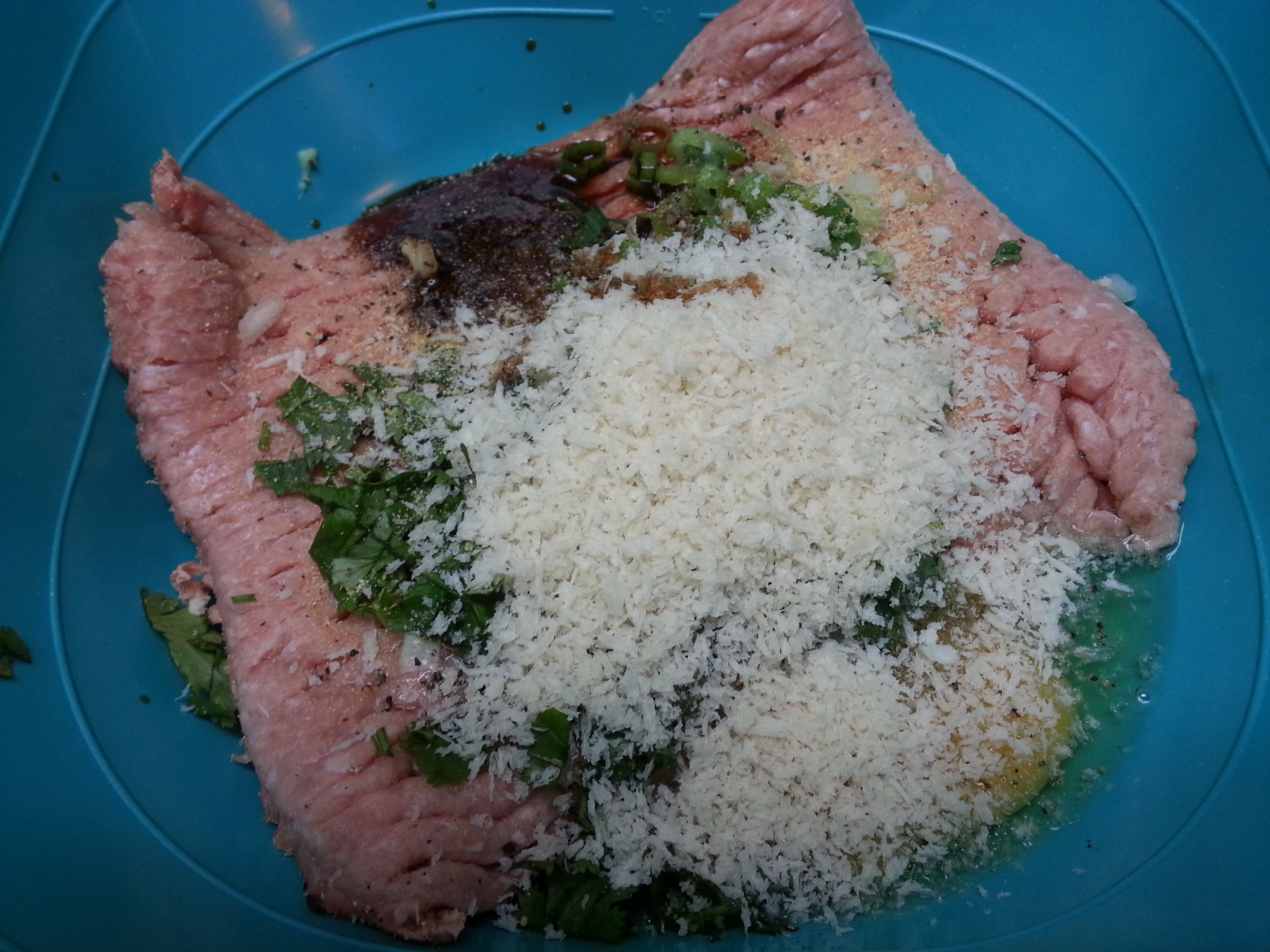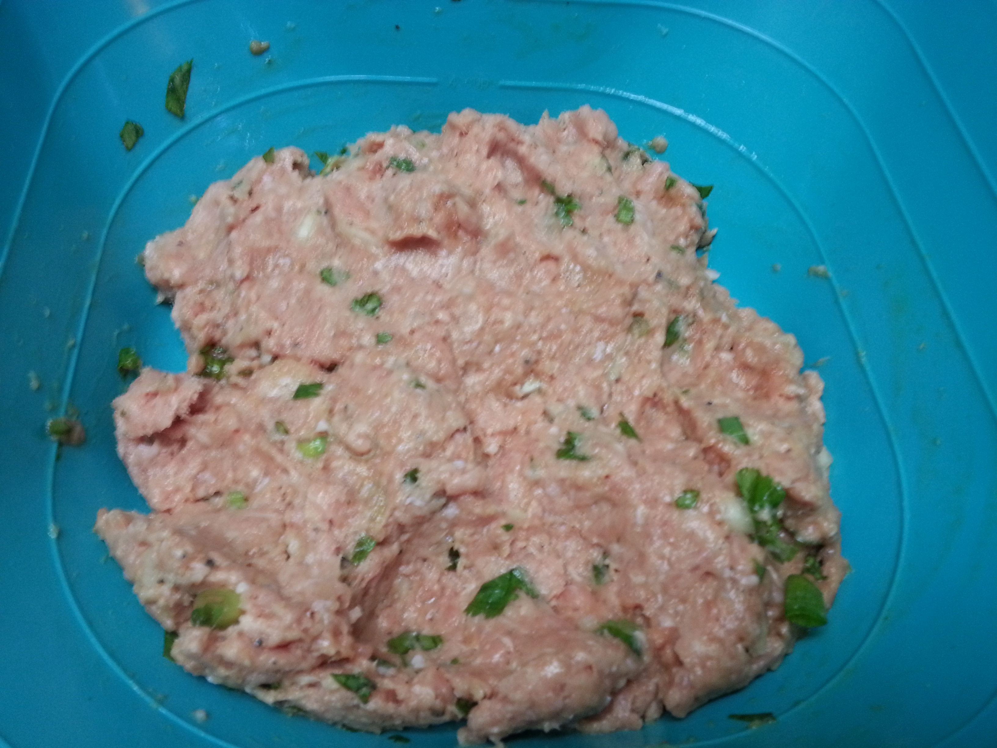 Add all of the ingredients to a large bowl, except 1/2 c. teriyaki sauce. With your hands, combine the meat mixture until evenly mixed. You can either put this back in the fridge for an hour or two or just go ahead and make your balls.